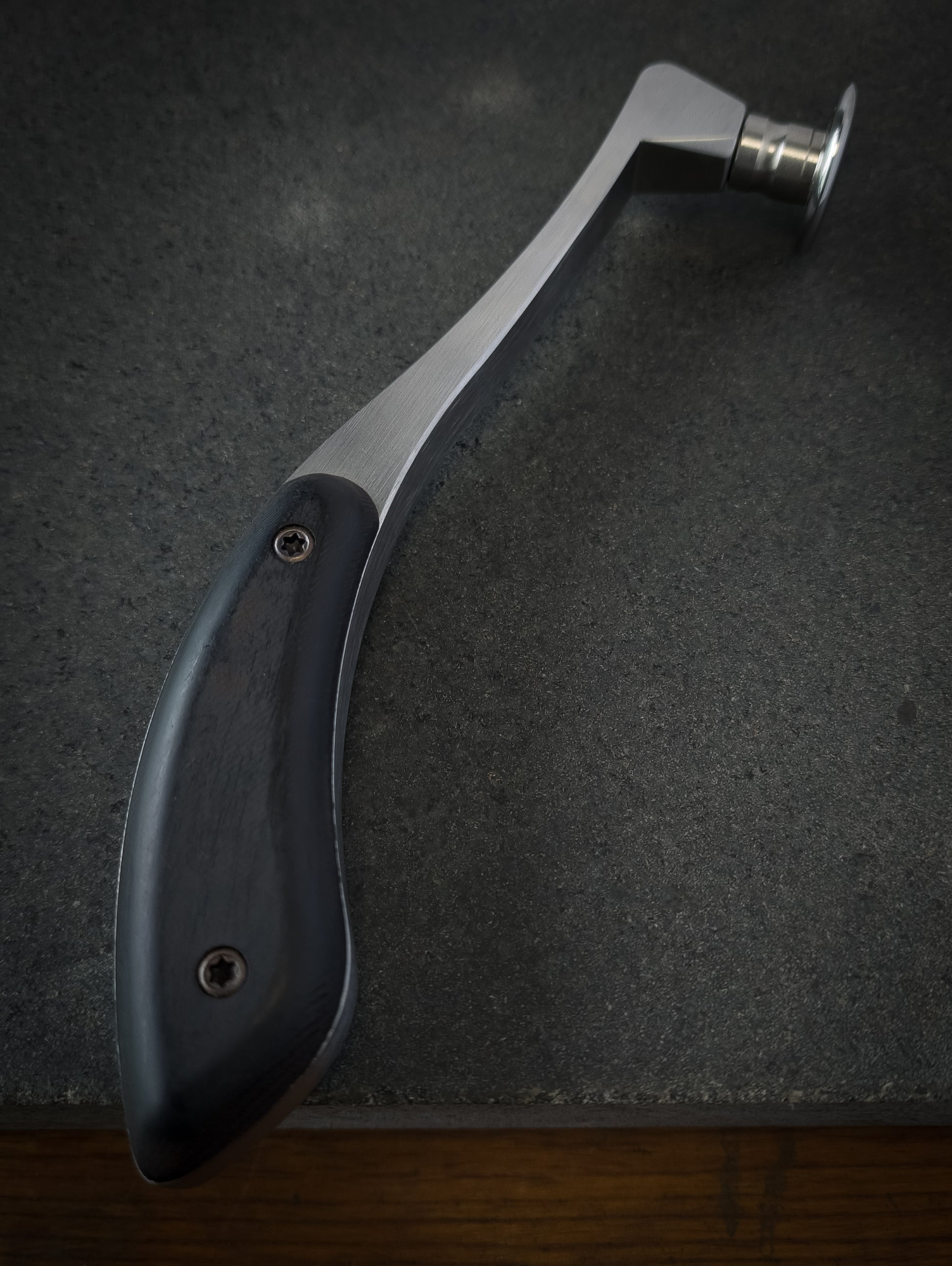 Handle is made from ebony and stainless steel. Length at ~195mm and weight at ~234g.