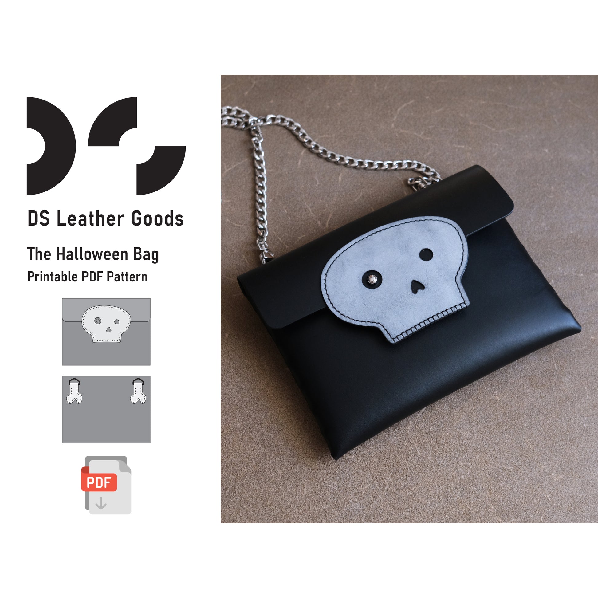 The Halloween Bag leather PDF pattern is a fun leather crafting project for the spooky season featuring a cute leather skull in the front of the bag. The template comes with detailed step-by-step assembly instructions accompanied by in-progress photos to guide you through the build. It includes patterns to make a leather strap in case you don't want to use a purse chain. The design features a no-sew gusset technique with hooks and holes for a quicker build.